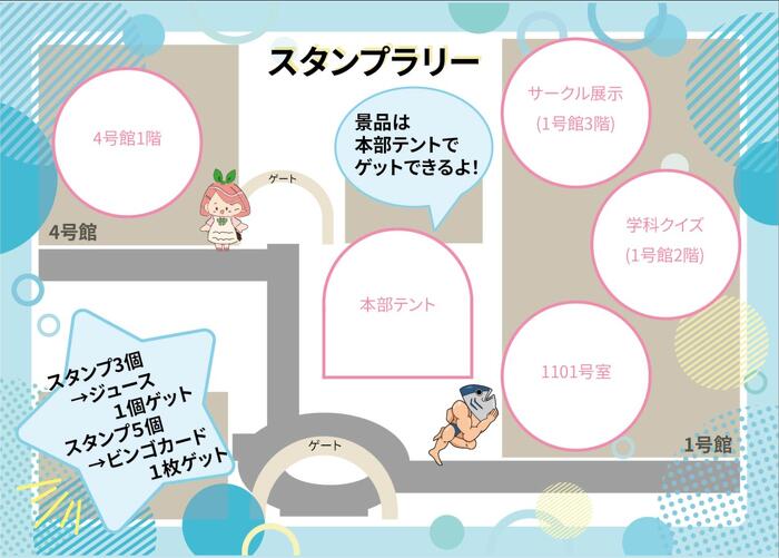 ※スタンプは本部テント、1101教室、1207教室、1号館3階、4号館1階の5箇所にあります スタンプ3つで→ジュース1個無料! スタンプ5つで→ビンゴカードをもう1枚ゲット!